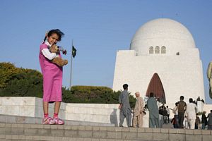 Mazar-e-Quaid, also known as the Jinnah Mausoleum or the National Mausoleum, is the final resting place of Quaid-e-Azam (Great Leader) Muhammad Ali Jinnah, the founder of Pakistan, as well as his sister, Māder-e Millat (Mother of the Nation) Fatima Jinnah, and Liaquat Ali Khan, the first Prime Minister of Pakistan. Located in the Jamshed Quarters neighborhood of Karachi, the mausoleum (Urdu: مزار (mazār), of Persian origin),was completed in the 1960s, is an iconic symbol of Karachi throughout the world. It is one of the most popular tourist destinations among foreign visitors to Karachi.