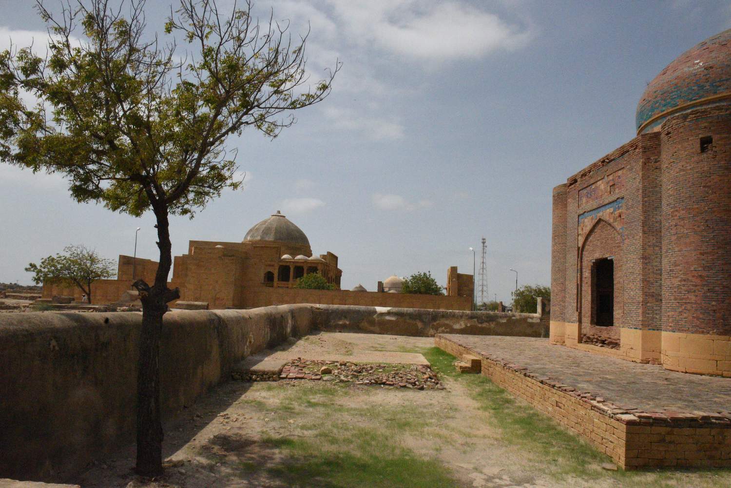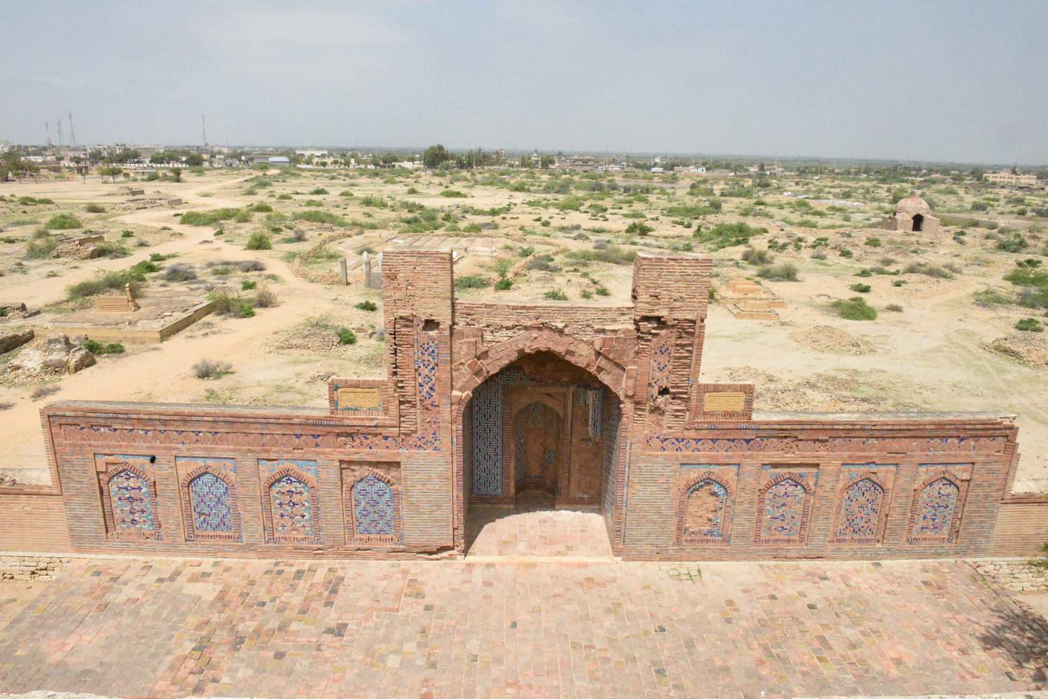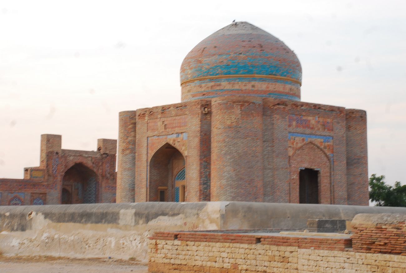 Diwan Shurfa Khan (d. 1638/1047 AH) was a minister in the state government during Mughal rule. His tomb, along with its adjoining mosque, is the best preserved and most colorful of the brick monuments on Makli Hill. The square plan tomb stands on a platform in a walled enclosure, and was originally covered with light blue tiles, along with its Persian style dome. The red brick walls have light blue tiles set in the joints. Round towers at each corner have an enclosed staircase leading to the roof.