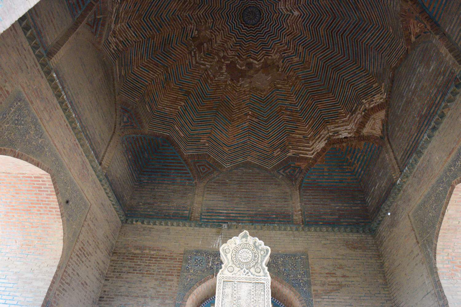 The interior of the dome is decorated in glazed bricks in a chevron pattern, and the mihrab in the western wall of the enclosure, as well as the central part of the mosque, are decorated with tiles.