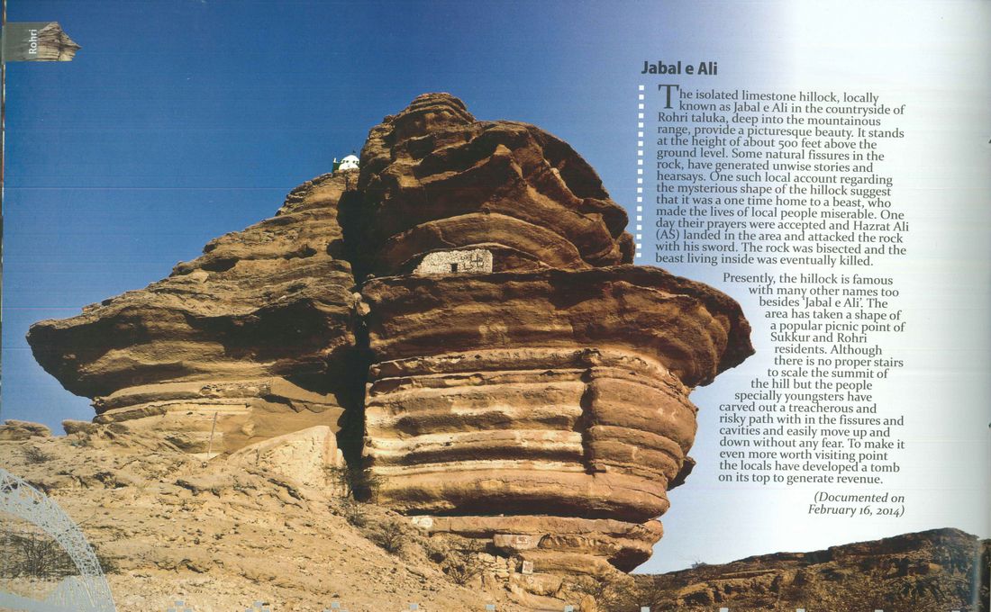 The isolated limestone hillock, locally known as Jabal e Ali in the countryside of Rohri taluka, deep into the mountainous range, provide a picturesque beauty. It stands at the height of aoout 500 feet above the ground level. Some natural fissures in the rock, have generated unwise stories and hearsays. One such local account regarding the mysterious shape of the hillock suggest that it was a one time home to a beast, who made the lives of local people miserable. One day their prayers were accepted and Hazrat Ali (AS) landed in the area and attacked the rock with his sword. The rock was bisected and the beast living inside was eventually killed.