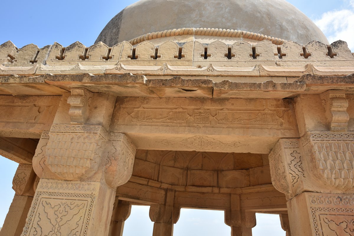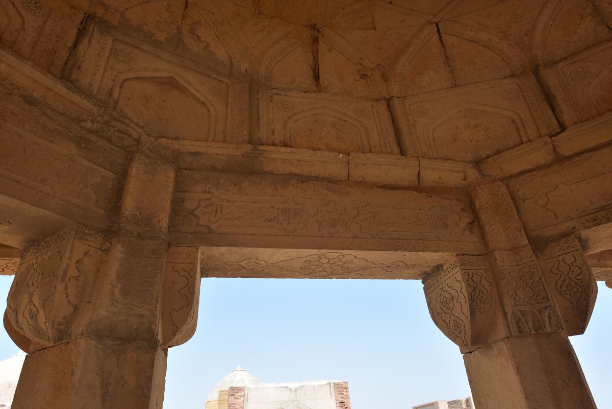 The tomb stands on a rectangular stone plinth, 4 feet high, measuring 27 feet each side, and approached by four steps. The tomb occupies the eastern side and in the western side there is a walled mosque. The tomb proper is 16-ft. 3-in. square, resting on twelve decorated square pillars and is crowned by a conical dome with the basal exterior decoration consisting of a twisted rope design. The pillars on the outside show low relief carving having a lobed oval design with an extra cross motif occupying the shaft with plain base but honeycombed capitals. On the inside the pillars have angular flutes. On the top the parapet is plain but has merlons and extended chajjas. The cross lintels which rest on two corner pillars. change the square into octagon. These lintels have a long rectangular motif terminating in semi-stars.