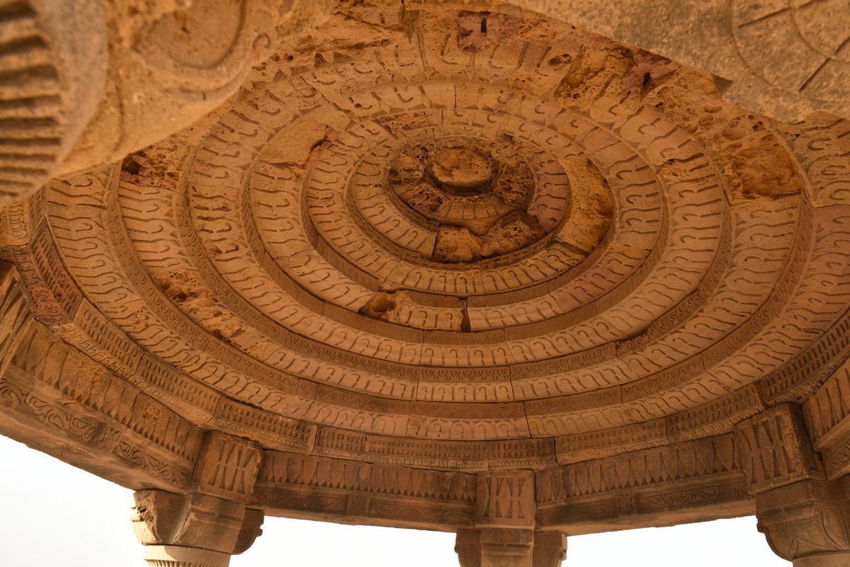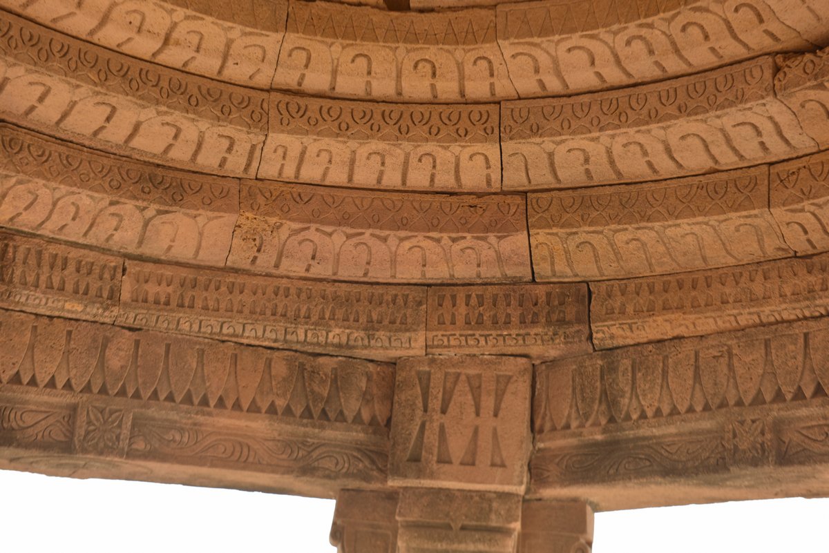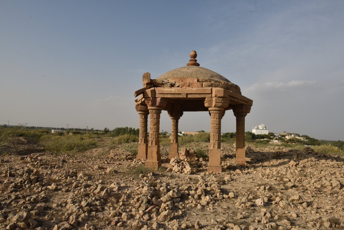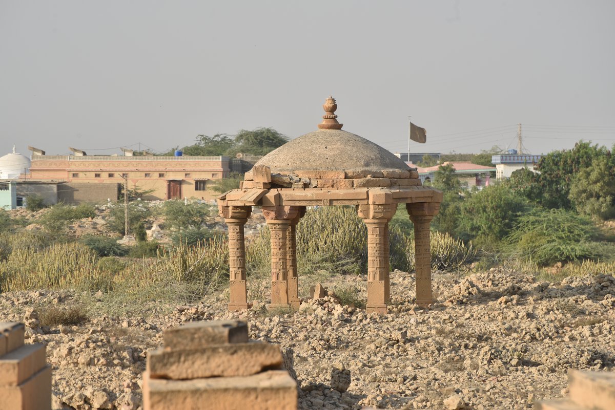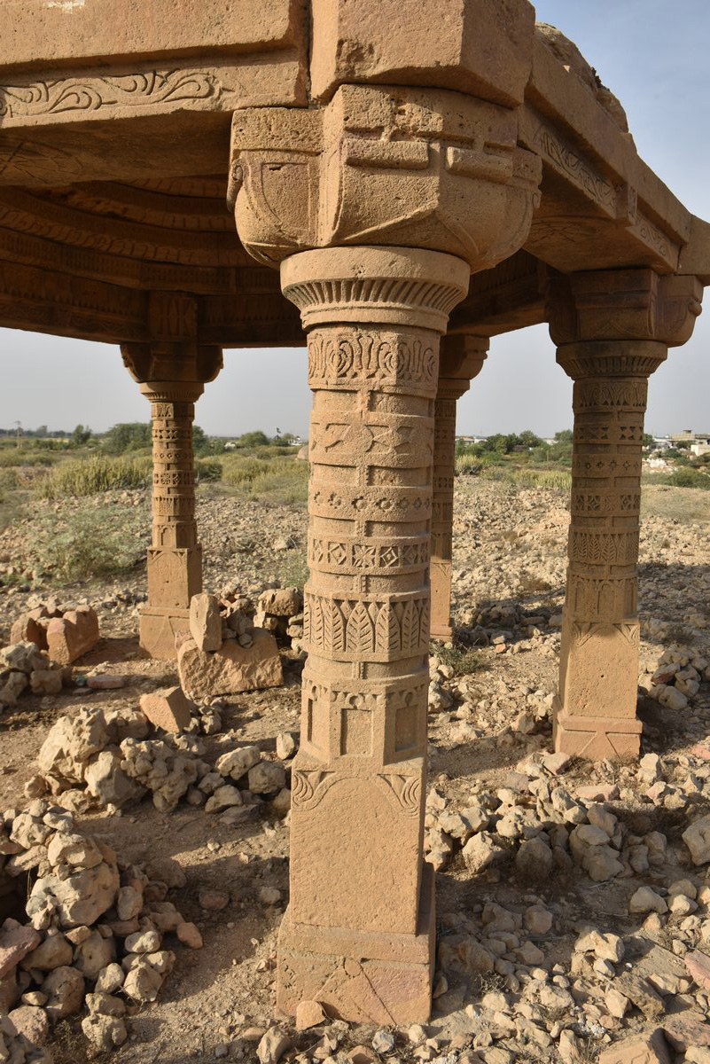 The hexagonal stone pavilion tomb carrying a corbelled dome with classical four-bracket capitals, is in an isolated location. Due to neglect, it is in a highly deteriorated and unkempt state. The roof has become extremely vulnerable, due to dislodging of stone pieces in the dome and loss of parapet, while capitals show accelerated decay and erosion. Although affect of 2010 rains and influx is probably minimal, lack of maintenance is the major cause of its degradation.