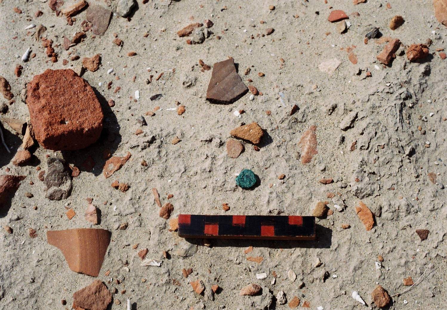 The site is of Mature Indus period (2400-1800), It measures 570 meters in length and 300 meters in width with approximate height of 02 meters from the surrounding area. Generally, burnt brick pieces, brick bats and terracotta vitrified slag's were littered/ scattered all over in huge concentration. A partially broken vessel, the vessel was filled with sandy clay which contained five pieces of broken shell bangles and a miniature pot. In the miniature pot (which was also filled with sandy clay) contained white disc beads; most of the beads were in was a very fragile condition, almost in the power from and could not be put together. The artifact collected includes various types of typical Indus pottery, terracotta beads, triangular cakes, bangles; stone objects like, cores hammer stones & unfinished cubical weight, lime stone piece; shell bangles, disc white beads; copper/bronze pieces.