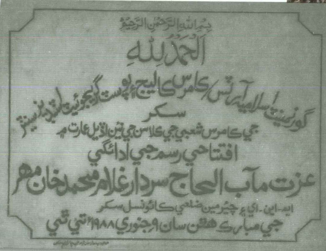The Islamia College, Sukkur, established in 1955 was also the part of same mission. Before the establishment of this college, the residents of Sukkur had to go to far off places like Shikarpur, Hyderabad, and Karachi for higher education. The college was initially started with arts and commerce faculty in a local school in the evening. Subsequently Islamia College Board acquired a big plot of land on a hill near the District Jail, where the present campus was established. In 1965 postgraduate classes in Urdu, Sindhi, and Muslim History were started, and in 1967 postgraduate classes in English and Economics and degree courses in Science were also introduced.