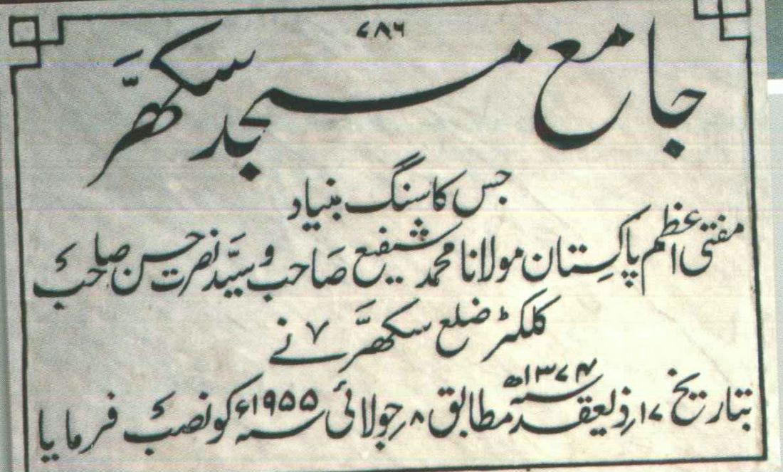 The mosque was jointly inaugurated by Mufti e Azam Pakistan, Molana Muhammad Shafee and Mr. Muhammad Nusrat Hussain, then Collector of Sukkur on July 8,1955.