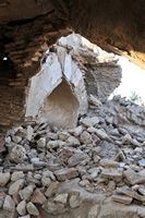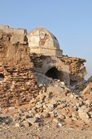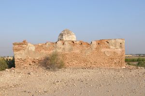 I think it is the Shiva Temple, as its construction resembles the Shiva Mandir near Manjhand, though this temple or ‘Tikano’ is older than the temple or Shivalo near Manjhand. The front side of the temple is towards the south-east and the back is towards the north-west. The temple is surrounded by a compound wall and has three portions. The portion with the dome is in the centre. The thin bricks are held together with gypsum (cheeroli) material. All the entrances are arched.