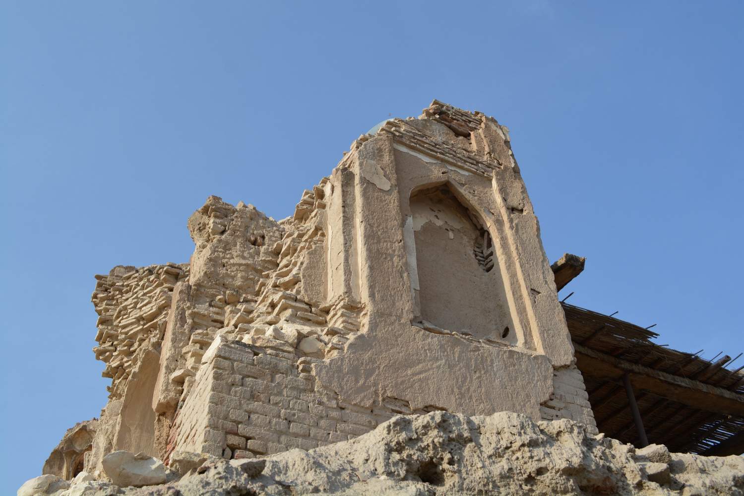 The mosque is located in Arore city, opposite Govt. Elementary Campus School Arore, Taluka Rohri District Sukkur. It is attributed to Muhammad Bin Qasim perhaps built in the 8th century A.D. At present only two walls are remaining of the structure, the total area measures about 45’-0” x 78’-0” feet (3510 sft).