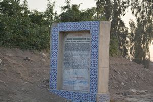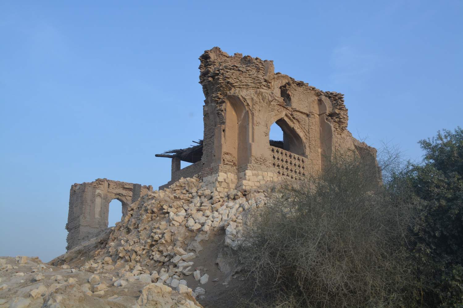 Mosque is load bearing structure which is constructed with burnt bricks (9” x 9” x 1.5”) with mud mortar, chiroli and lime. The mosque consists of two entrances, decorated with Tudor arches and Tudor arched rectangular panels are designed symmetrically on the left and right side of the open arch. Tudor arched ventilators are also constructed on above of opening arch. Newly constructed area for prayers is made with cemented material. There is only one window on the western side wall and decorated with bricks jali. The lime stone blocks were found in large quantity in various parts of the site where the cultural material were seen embedded in the section of a burrow. Mosque is almost 95% destroyed.
