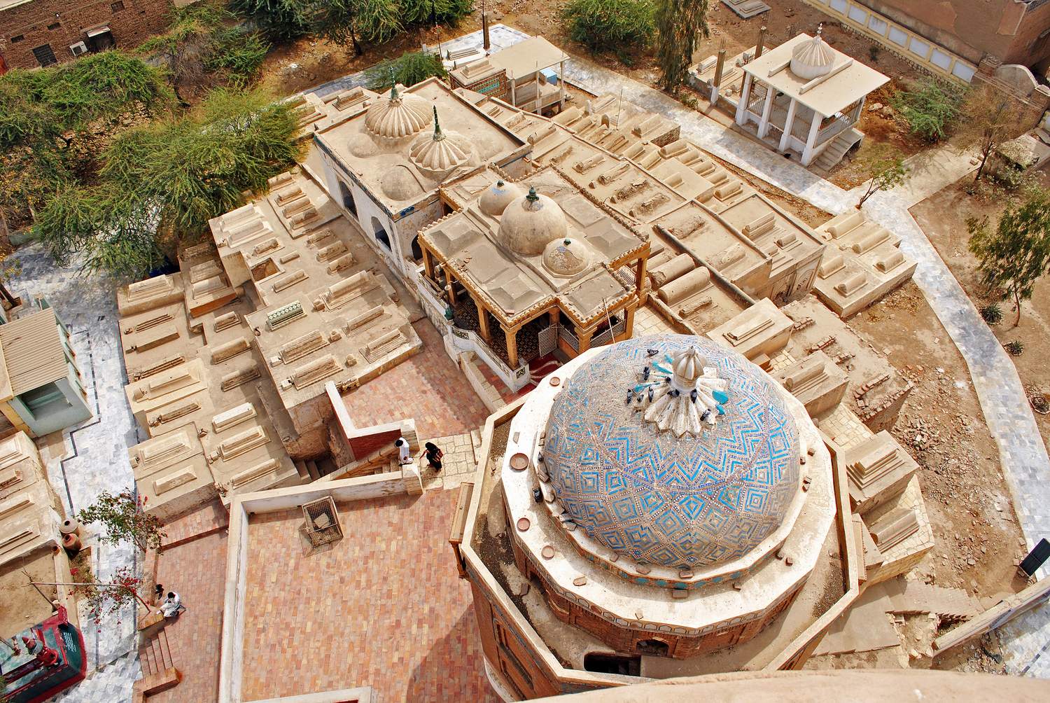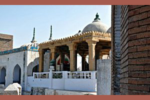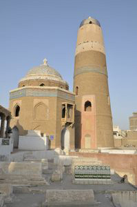 The minaret of Ali Abuzar is the most conspicuous structure of Sukkur town, dating back to 1607 during the Mughal Abuzar Empire in the Indian subcontinent. Masum Shah was the governor of Mughal Emperor Akbar who appointed him as the Nawab of Sukkur. The minaret was built in about 1607 the monument, built of red brick, is more or less conical in shape, slightly off the perpendicular and surmounted by a dome to which an internal stone staircase gives an access. It is about 26 metres in circumference and has 84 steps to the top. It is about 31 metres feet in height and can be seen from miles away. This minaret is believed to have been used as a watch tower.
