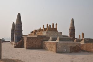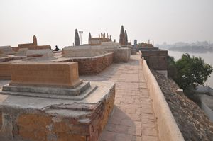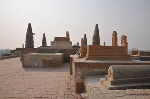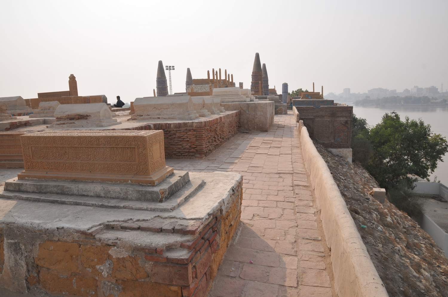 On one of the smaller hills that arises out of the river bank on the south has a leveled platform on which there are many carved gravestones like those on the Makli Hill at Thatta with chain ornaments and panels of Arabic quotations from the Quran. The entire space between the graves is paved and a flight of stairs leads up to the platform from the southside. Enameled tiled work is freely used on these tombs, most of which are dated between 1609 and 1883 AD. The principal grave is that of Mir Qasim one of the Sabzwari Shahids dated 1018 AD. This was probably the grave that sanctified the place, and the lamp post and lamp that were placed in front of it are still there; and it gives the name of Than Qasim Shah to the hill. However, it is more popularly known as the hill of the seven virgins.