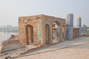 A small mosque on the upper level and the western section is profusely embellished with blue, turquoise and white tile-work. Tradition states that when the Mir completed this fine complex, he would retire to it on full moon nights with friends and courtiers and entertain them to music, mangoes, sweets, honey and watermelons. The grand remnant of a bygone era is, unfortunately, in a state of ruin though it is a popular resort for picnickers and tourists.